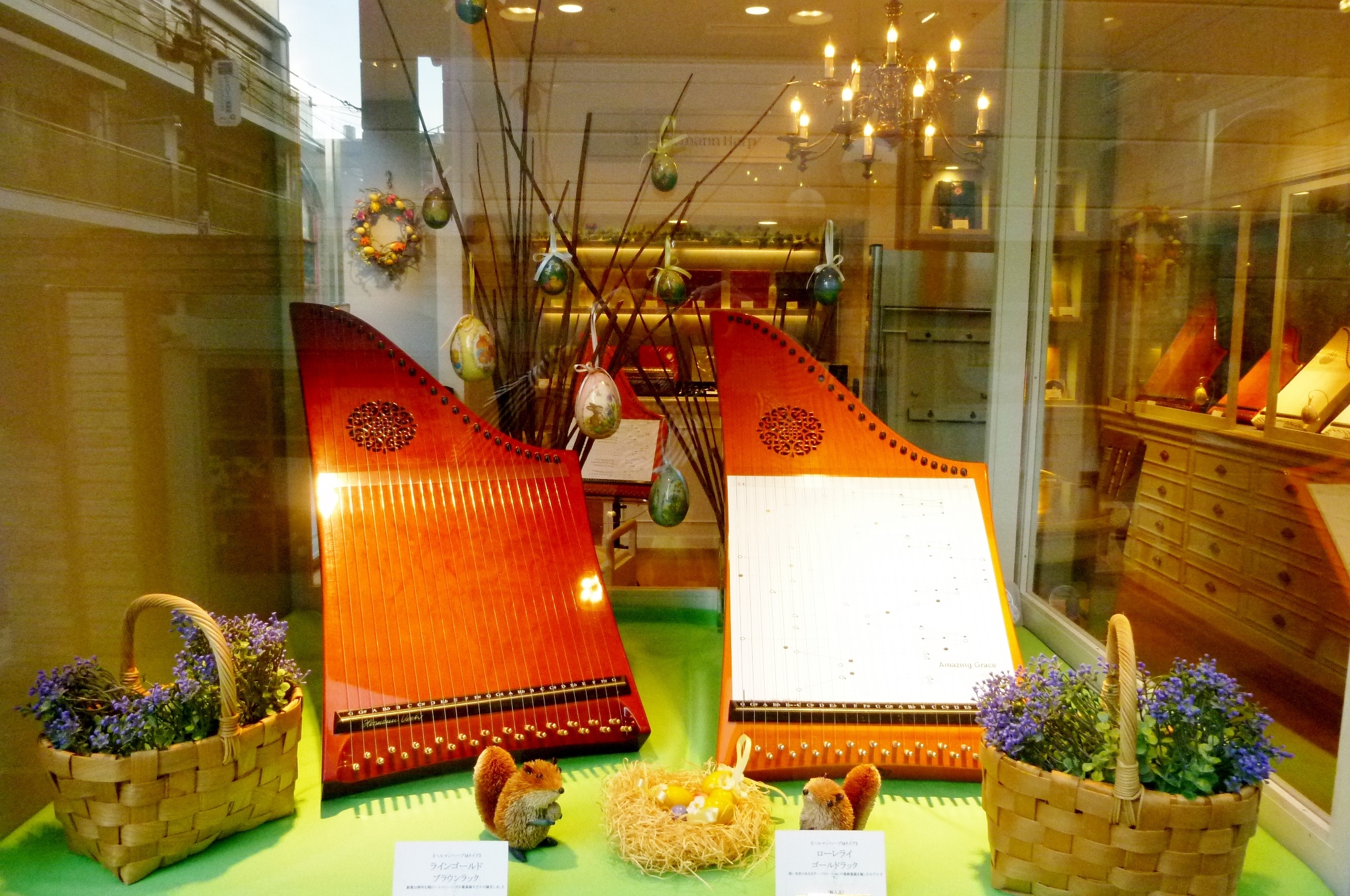 ヘルマンハープ青山店のディスプレイもこの通り、イースターの飾りで春らしさを演出しています。